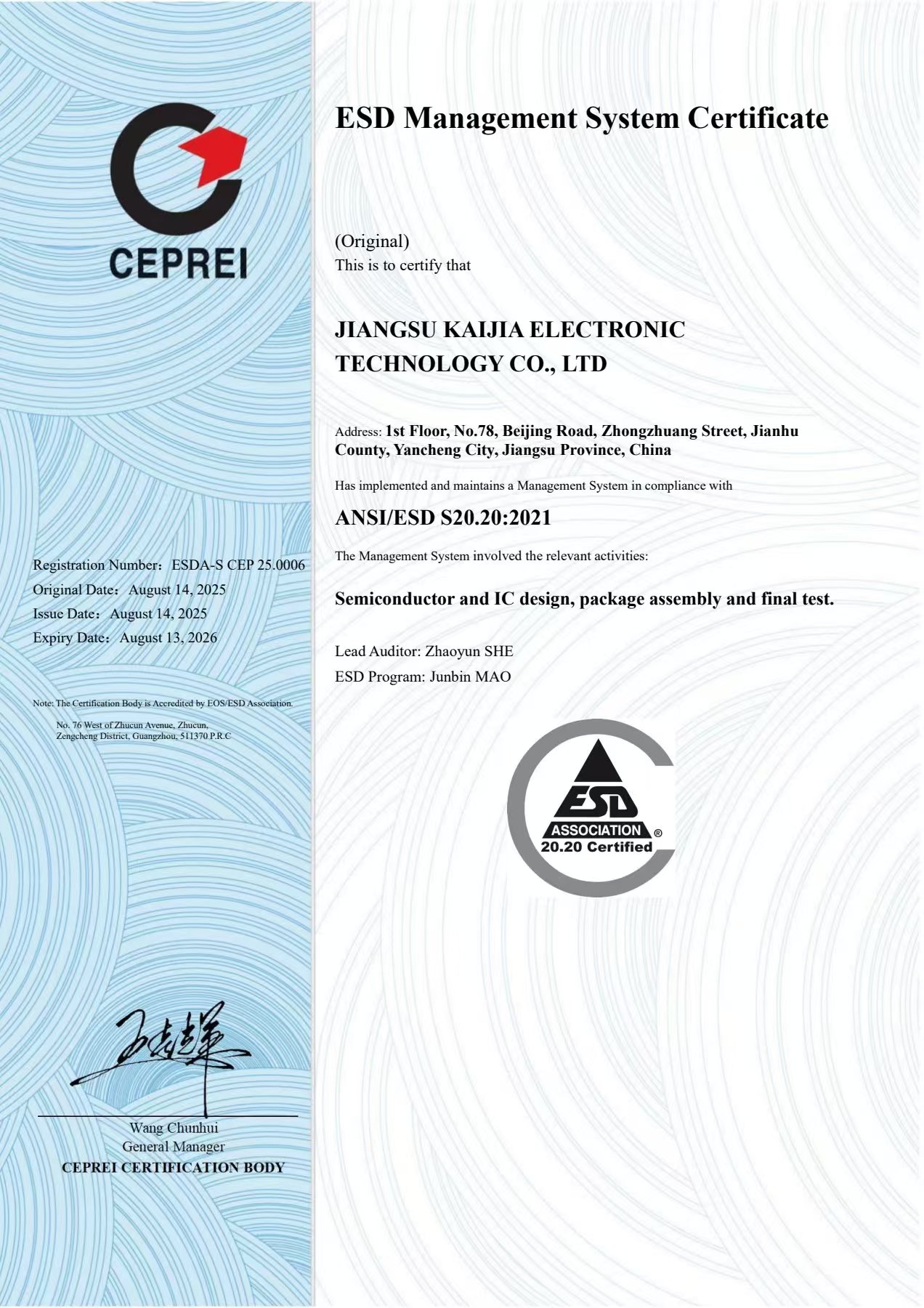 凯嘉科技通过ESD S20.20静电防护管理体系认证
